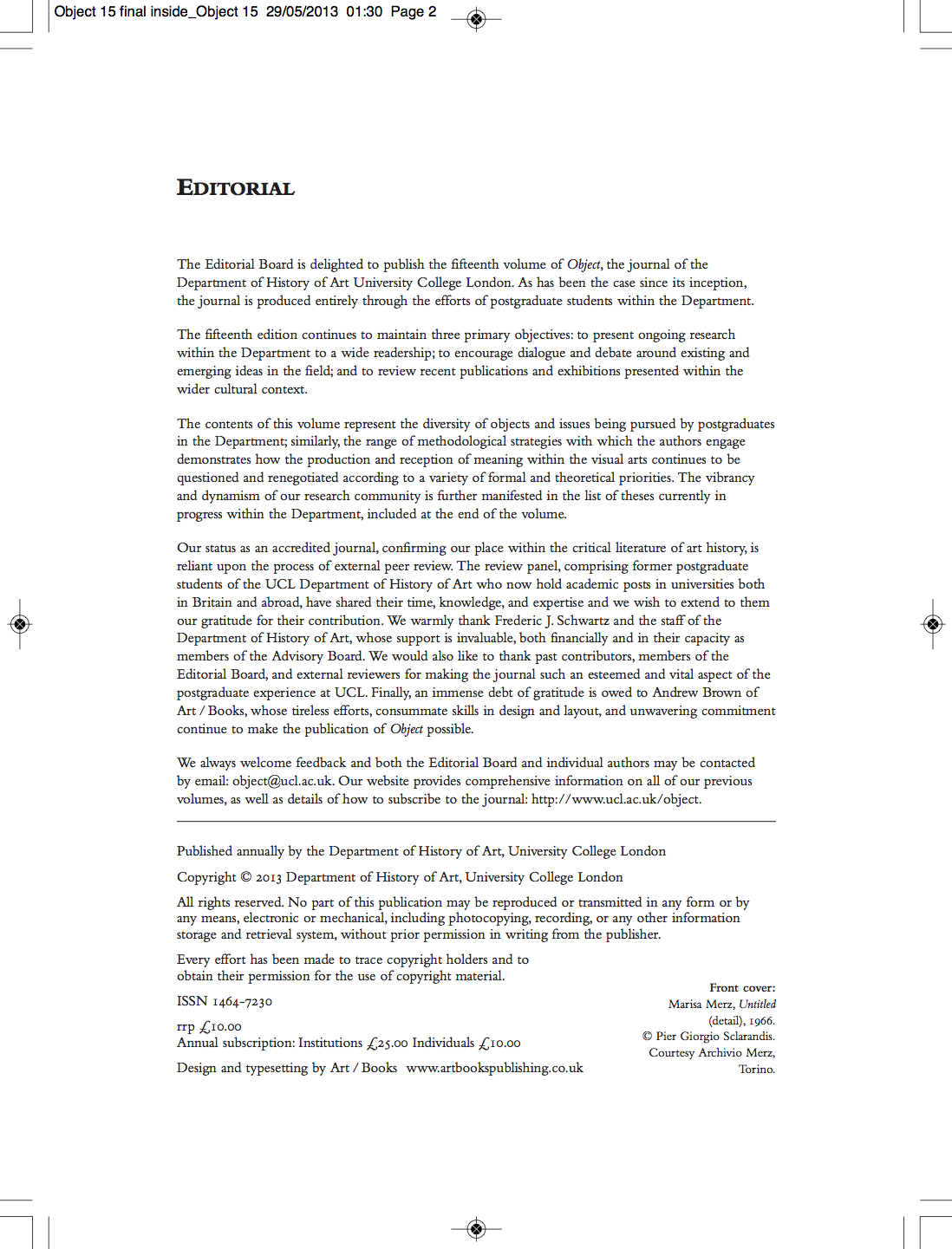 OBJECT is a peer-reviewed academic journal published at University College London. It is entirely produced by doctoral candidates enrolled in the University’s Department of the History of Art. Through object- and theory-based analyses, contributors to the journal explore the diversity of issues and methodologies with which art history graduate students are engaged.